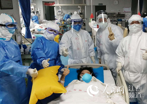 江西中醫藥大學第二附屬醫院援助隊重癥團隊、武漢五院重癥團隊共同努力,又一名危重病患者順利脫機轉入普通病房。(余小燕 攝)