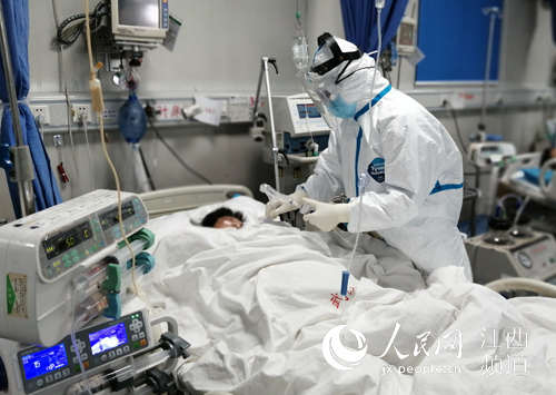 江西中醫藥大學二附院醫療隊隊員給病人進行密閉式吸痰(武瀚仁 攝)