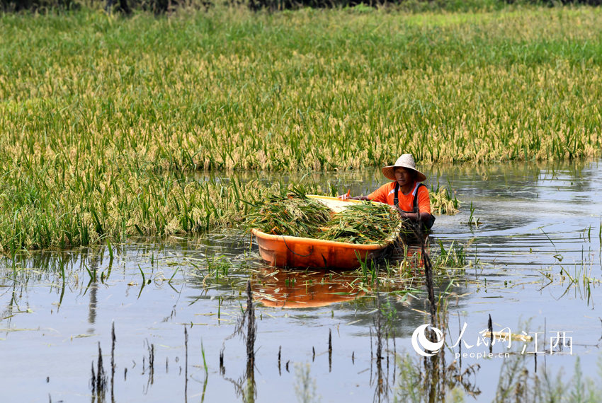 老郭在洪水中“收割”水稻(人民網 時雨/攝)