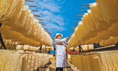 圖為近日,都昌縣陽峰鄉金星村村民在晾曬面條。
