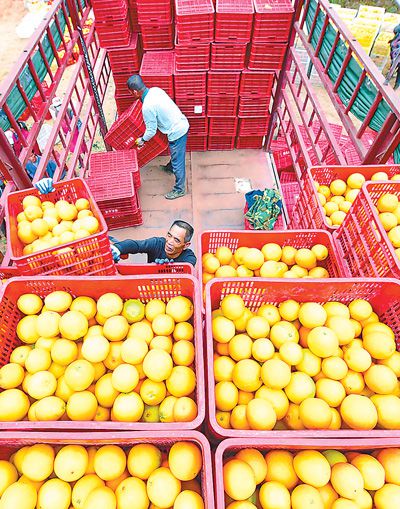 今年冬季,江西省會昌縣的20萬畝臍橙喜獲豐收。近年來,會昌縣依托土壤、氣候、光照等自然地理優勢,發展綠色果業經濟,吸納貧困戶參與臍橙種植管理、加工銷售。圖為12月8日果農在種植基地分揀、搬運臍橙。