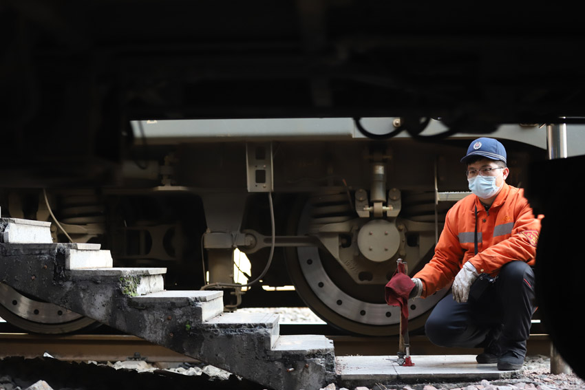 駐站檢車員在檢查列車運行狀態。肖堯 攝