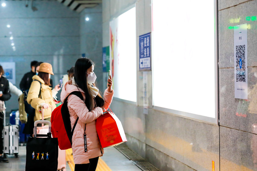 出站通道內,下車出站的旅客正在掃描健康通行二維碼,準備測溫出站。鄒陽 攝