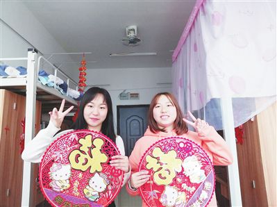 “前幾天,宿舍管理員帶著我們打掃寢室、掛燈籠、貼窗花、貼對聯,看著自己動手裝扮的宿舍,過年的氣氛更濃了,感覺好開心!
