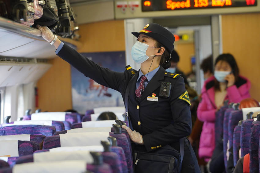 安全是乘坐列車時最為重要的事情。開車后,燕珍珍時常通過廣播進行禁煙、文明出行、鐵路信用通告宣傳,巡視車廂時發現行李架物品擺放不到位,會立即使用對講機通知乘務人員進行整理,以防行李滑落砸傷旅客。列車即將到站時,她會前往車門提前立崗進站,組織旅客安全乘降,提示大家注意腳下安全。