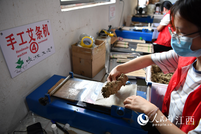 艾成品生產車間,工人們正在進行手工制作艾條。(人民網 時雨攝)