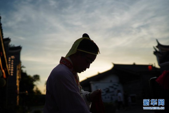 封永泉為采茶戲表演做準備工作(7月21日攝)。
