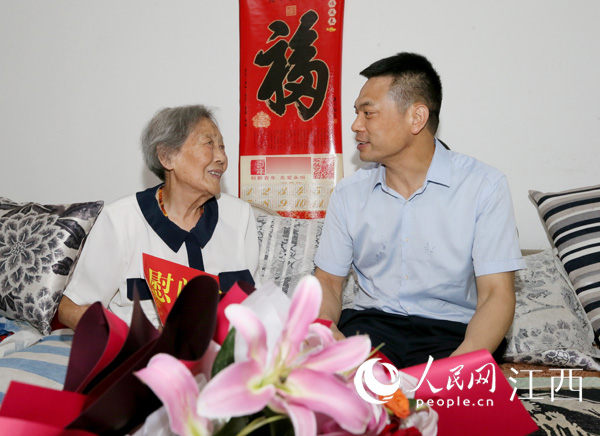 2021年7月13日,九江市委書記、市長謝來發(右)走訪慰問英烈遺屬曹旭慈老人,并通過她向全市廣大烈士家屬致以誠摯問候和崇高敬意。( 楊青 攝)