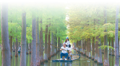 10月6日,江蘇宿遷洪澤湖濕地景區,游客們在水杉林中撐竹筏。