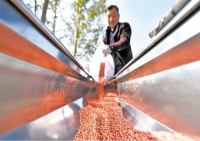 10月13日,山東聊城茌平區肖家莊鎮田莊村農民往播種機里添加小麥種子。