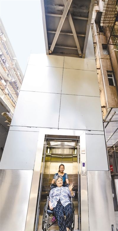 江西省贛州市解放街道洪城巷社區,居民使用新加裝的電梯,推著家中老人下樓。
