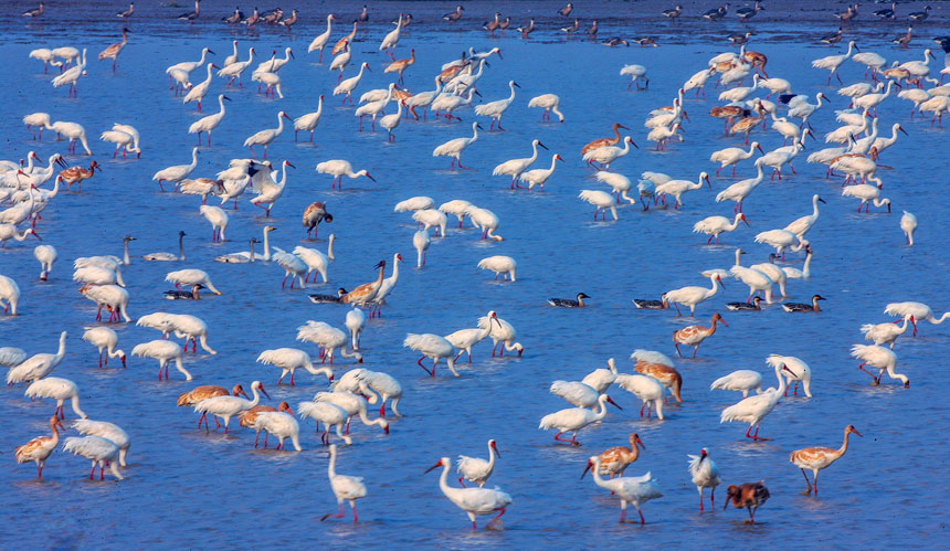 鄱陽湖候鳥在覓食。江西鄱陽湖國家級自然保護區管理局供圖