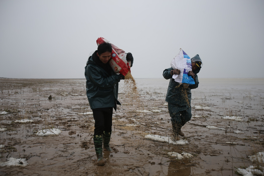 王小龍(右)與同事冰雪天為候鳥投食。江西鄱陽湖國家級自然保護區管理局供圖