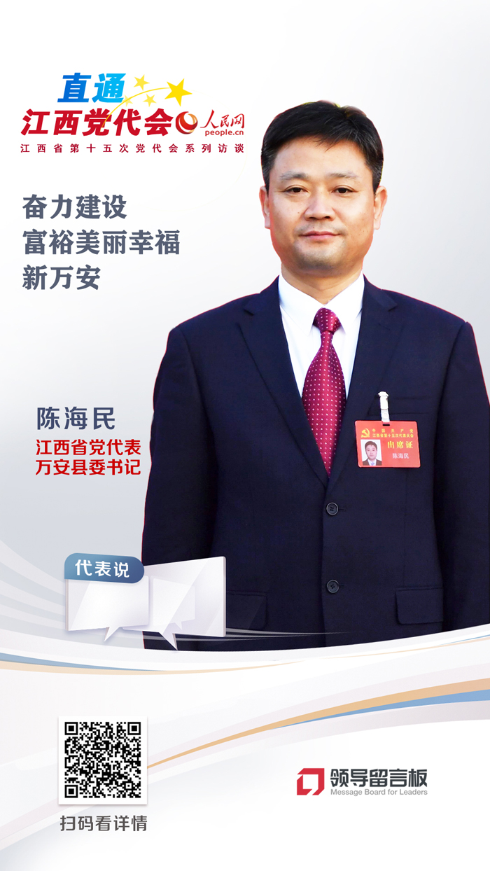 人民網:中國共產黨江西省第十五次代表大會已經開幕,易煉紅同志代表中國共產黨江西省第十四屆委員會作的報告,吹響了未來五年江西發展的號角。請問陳海民代表,萬安縣將如何貫徹落實省第十五次黨代會精神?
