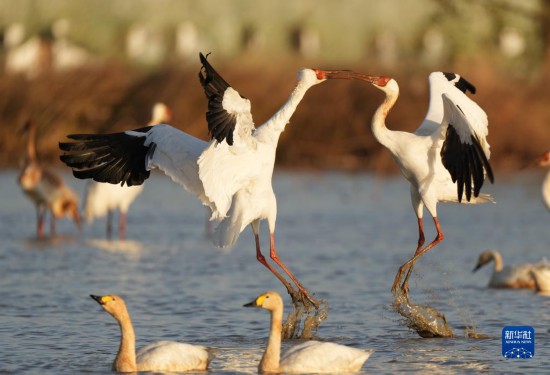 入冬以來,大批候鳥陸續飛抵江西鄱陽湖濕地休養生息。位于鄱陽湖畔南昌高新區鯉魚洲管理處的五星白鶴保護小區里,白鶴、天鵝、鷺鳥等各種候鳥飛翔、覓食,成為鄱陽湖區一道特別的風景。新華社記者 周密 攝