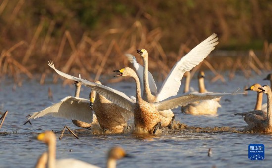 入冬以來,大批候鳥陸續飛抵江西鄱陽湖濕地休養生息。位于鄱陽湖畔南昌高新區鯉魚洲管理處的五星白鶴保護小區里,白鶴、天鵝、鷺鳥等各種候鳥飛翔、覓食,成為鄱陽湖區一道特別的風景。新華社記者 周密 攝