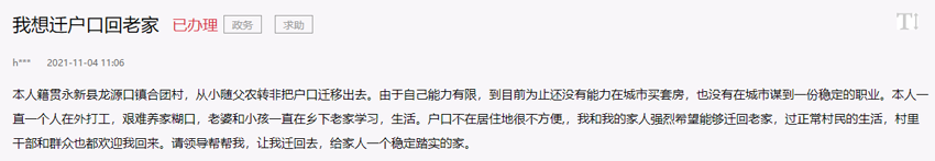 “本人從小隨父親‘農轉非’把戶口遷移出去,到目前為止沒能在城市買套房,也沒有謀到一份穩定的職業,一直在外打工,老婆和小孩卻在老家生活學習,兩地分居很不方便!苯,網友給吉安市委書記留言,稱其想將戶口遷回老家與家人團聚。