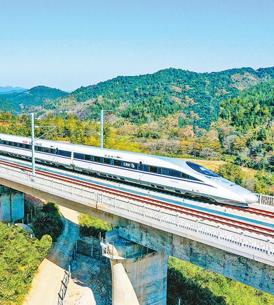 圖為12月2日,試運行的贛深高鐵動車組列車馳騁在綠水青山間。