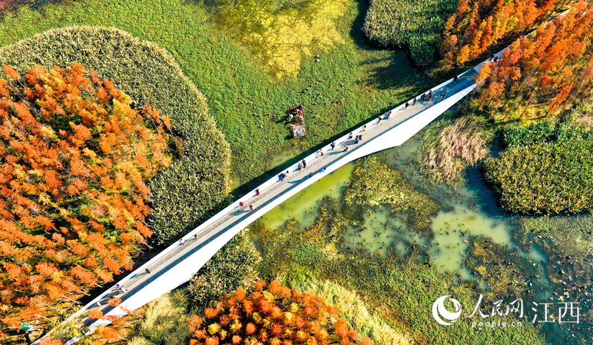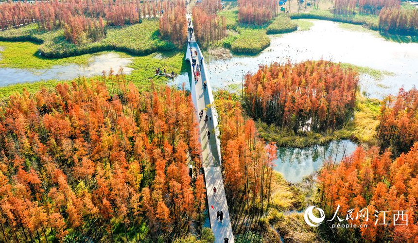 南昌市高新區魚尾洲公園層林盡染,色彩斑斕(無人機照片)。鮑贛生攝