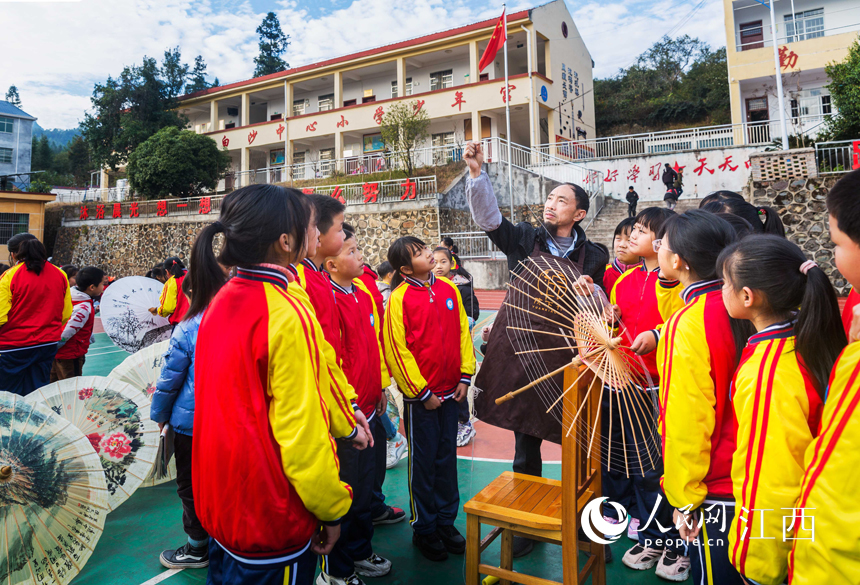 永新縣曲白鄉白沙小學,當地油紙傘制作手藝人在向孩子們講解油紙傘的制作技藝。吳麗萍攝