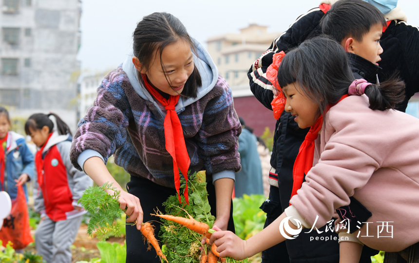 12月29日,在定南縣第三小學校內勞動實踐基地,學生們在采摘蔬菜。詹繼成攝