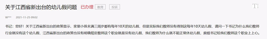 “江西省新出臺的政策顯示,家里小孩未滿三周歲都有每年10天的育兒假,但是實際到我申請的時候卻沒有得到批準。我們教師為什么就不能正常休育兒假,麻煩領導為教師群體上上心!本W友通過人民網“領導留言板”向江西省瑞金市委書記留言,希望所在地教師能同步享受江西省新出臺的育兒假政策。