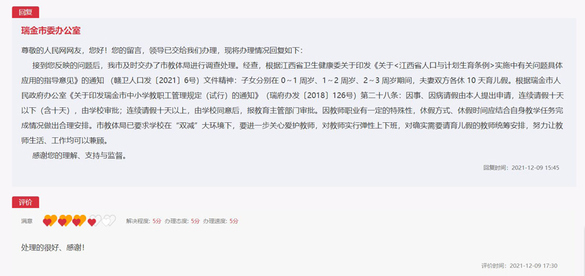 據悉,瑞金市教體局已要求學校在落實“雙減”政策的同時,要進一步關心愛護教師,對教師實行彈性上下班,對確實需要請育兒假的教師統籌安排,努力讓教師生活、工作均可以兼顧。