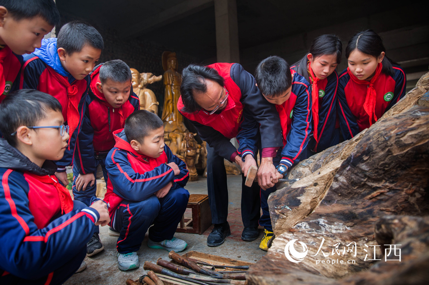 圖為永新縣龍門鎮黃崗村雕刻師汪生華在向當地學生傳授雕刻技藝。周亞茂攝