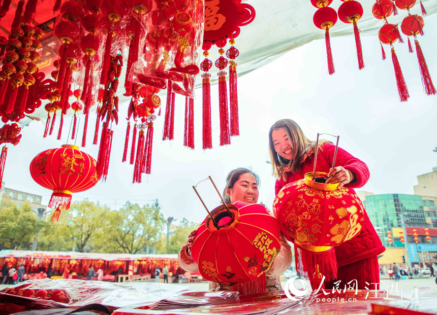 人民網南昌1月24日電 隨著春節的臨近,江西省吉安市永新縣各大年貨市場紅紅火火年味十足,春聯、紅燈籠、中國結等傳統節日喜慶飾品琳瑯滿目,吸引了大批市民前來選購。(邱燁、朱國朝)