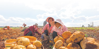 日前,云南省曲靖市陸良縣小百戶鎮章柏村農民趁著晴好天氣,采收地里的馬鈴薯。