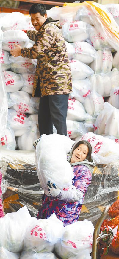 1月11日,江西省贛州市華東城農副產品綜合市場,蔬菜批發經營戶在搬運蔬菜。