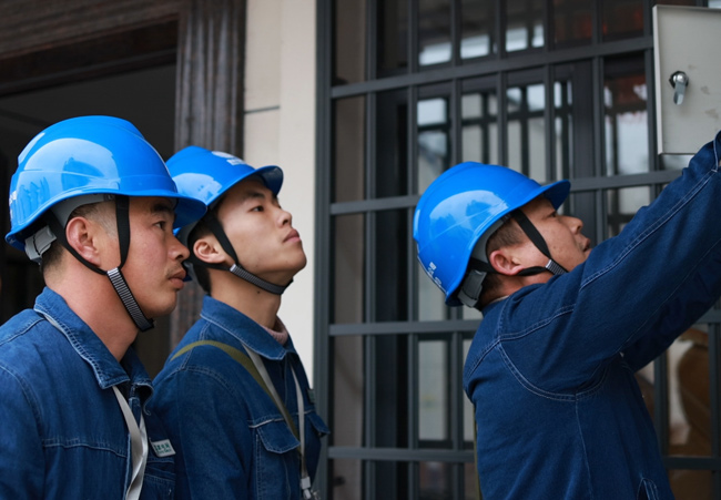 車寒英(右一)正在給安置點住戶排查用電故障。