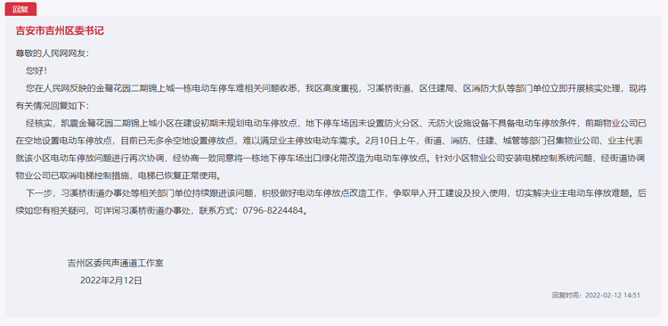 人民網南昌2月18日電(記者邱燁)“自2011年8月反映過金鷺花園二期錦上城小區的停車問題后,直到現在還沒有解決。物業和開發商一直在拖,直至不了了之!本W友通過人民網“領導留言板”向江西省吉安市吉州區委書記留言,反映小區電動車停車難問題。
