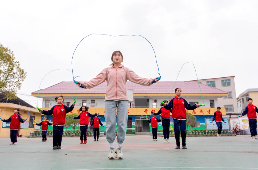 跳繩興趣小組的學生在老師的帶領下一起練習跳繩。劉平華攝
