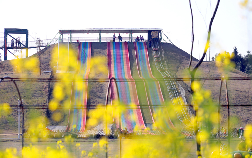 游客在油菜花海旁體驗彩虹滑道。何賤來攝