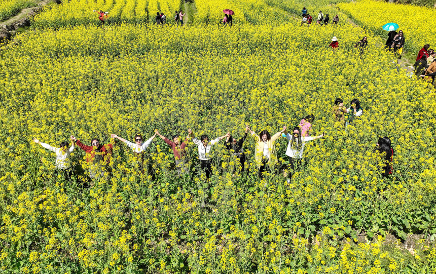 游客正在江西省撫州市廣昌縣驛前鎮姚西村百畝油菜花田間賞花拍照。曾恒貴攝