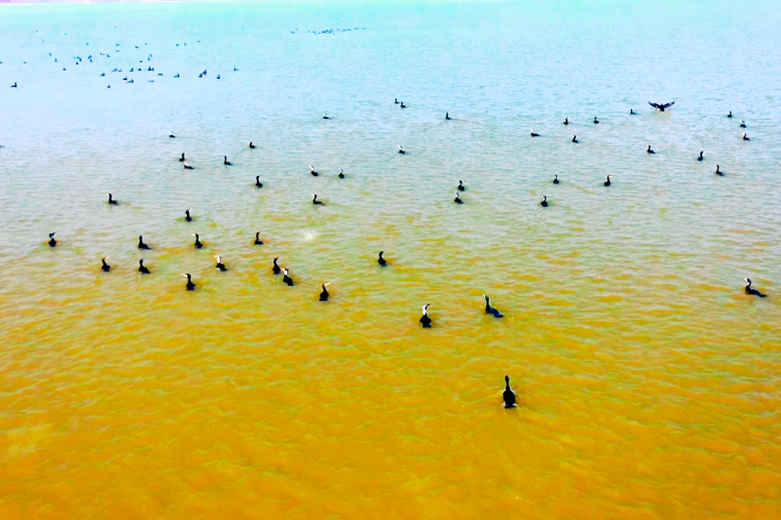雁群在水中游弋、嬉戲。況建攝