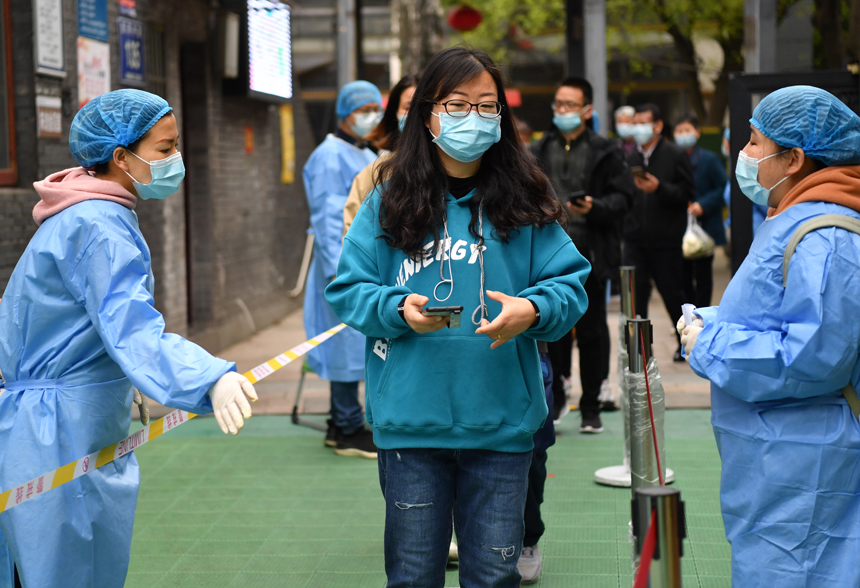 南昌珠市學校棉花市校區的老師來到防控一線,引導市民進場檢測。 人民網 時雨攝