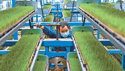 3月24日,江西省吉安市吉水縣醪橋鎮黃泥洞農業科技智能化育苗工廠工作人員,在廠棚區里對機械進行精心調試,并仔細觀察新育秧苗生長發育趨勢,確保今年早稻秧苗品質優良,為今年早稻豐收、農民增收打下良好基礎。