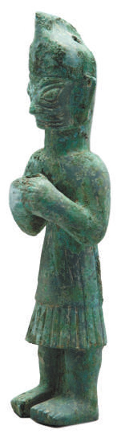 三星堆商代遺址出土戴尖帽銅立人像。