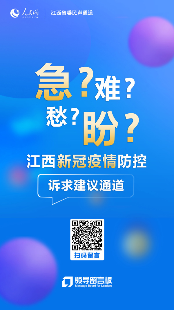疫情防控期間,人民網聯合江西省委民聲通道在“領導留言板”開設“江西省新冠疫情防控訴求與建議通道”,在生產生活中您有哪些急難愁盼問題,對疫情防控工作您有哪些意見建議,歡迎來這里留言。您的留言將由江西省委民聲通道轉交相關責任單位。