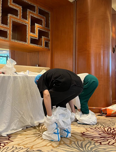隊員們利用休息時間反復練習正確、規范穿脫防護服