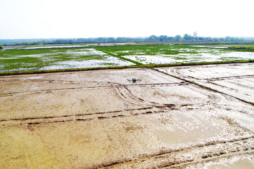 在金湖鄉五合村,種植戶利用農用專業無人機在水田中實施水稻直播作業。虢天明攝