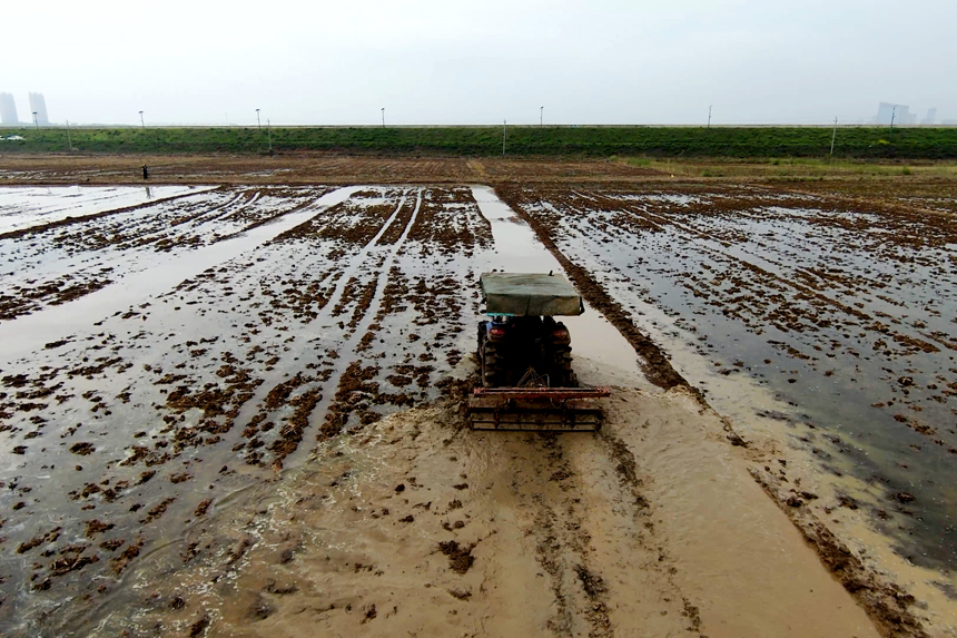 在高標準農田內,翻耕機正在田里進行作業。虢天明攝