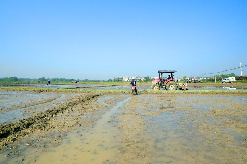 農戶在宜豐縣石市鎮梨樹村耕作早稻田。何賤來攝