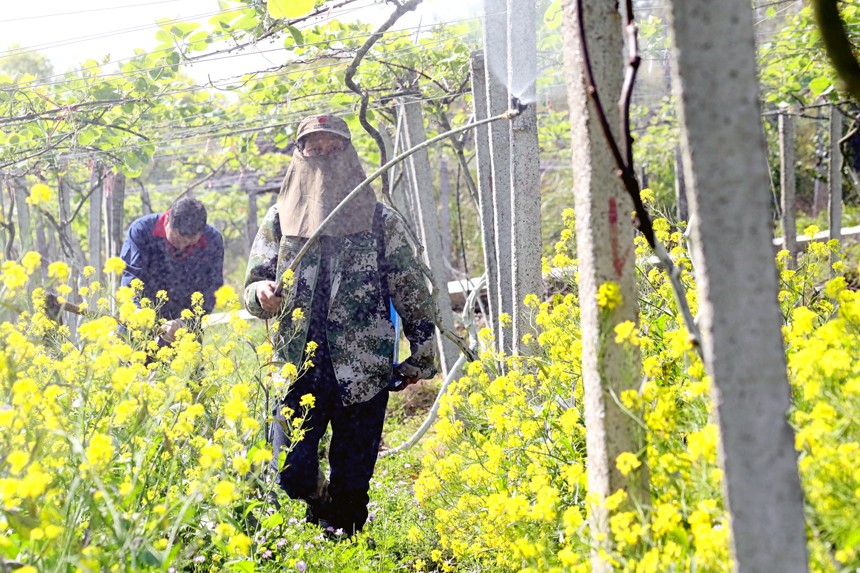 果農在宜豐縣黃墾鎮九嶺種養專業合作社管護紅心獼猴桃。何賤來攝