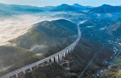 江西省萍鄉市白竺鄉,高速公路在群山間蜿蜒。當地便利的交通條件加快了山區農產品的流通速度,促進高速公路沿線優勢產業和旅游業發展。