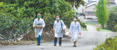 江西省宜春市上高縣,南港鎮衛生院家庭醫生服務團隊隊員走在大窩里村的路上,為村民送醫送藥。周 亮攝(影像中國)