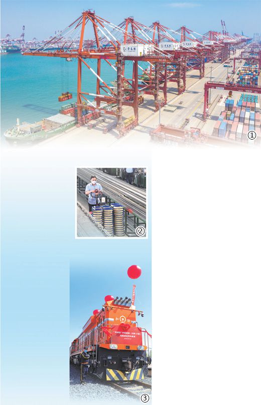 圖①:山東港口青島港前灣集裝箱碼頭一派繁忙景象。
