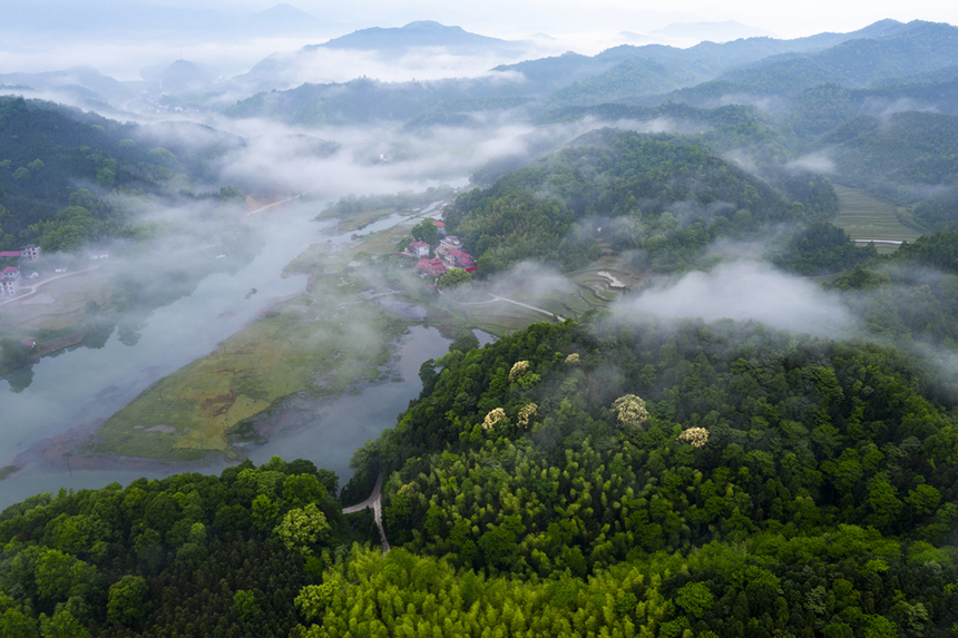 村莊藏于青山綠水間,宛如一幅幅沒有邊框的秀美畫卷。周秋賢 攝